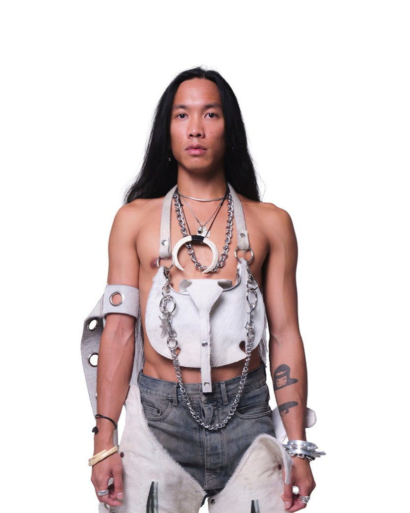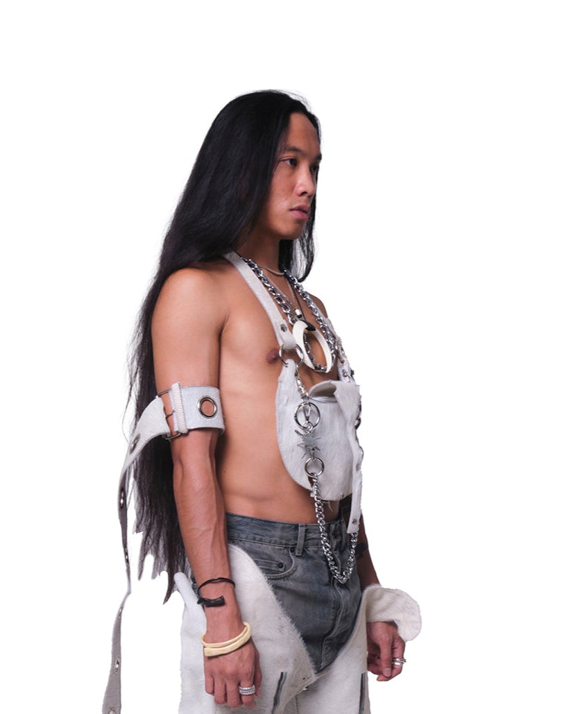 Raw cowhide cutaway mini handbag featuring snap button straps and ties to alter length to wear on body as bib. Features metal zip and chain hardware with Pigsuit logos and emblems.