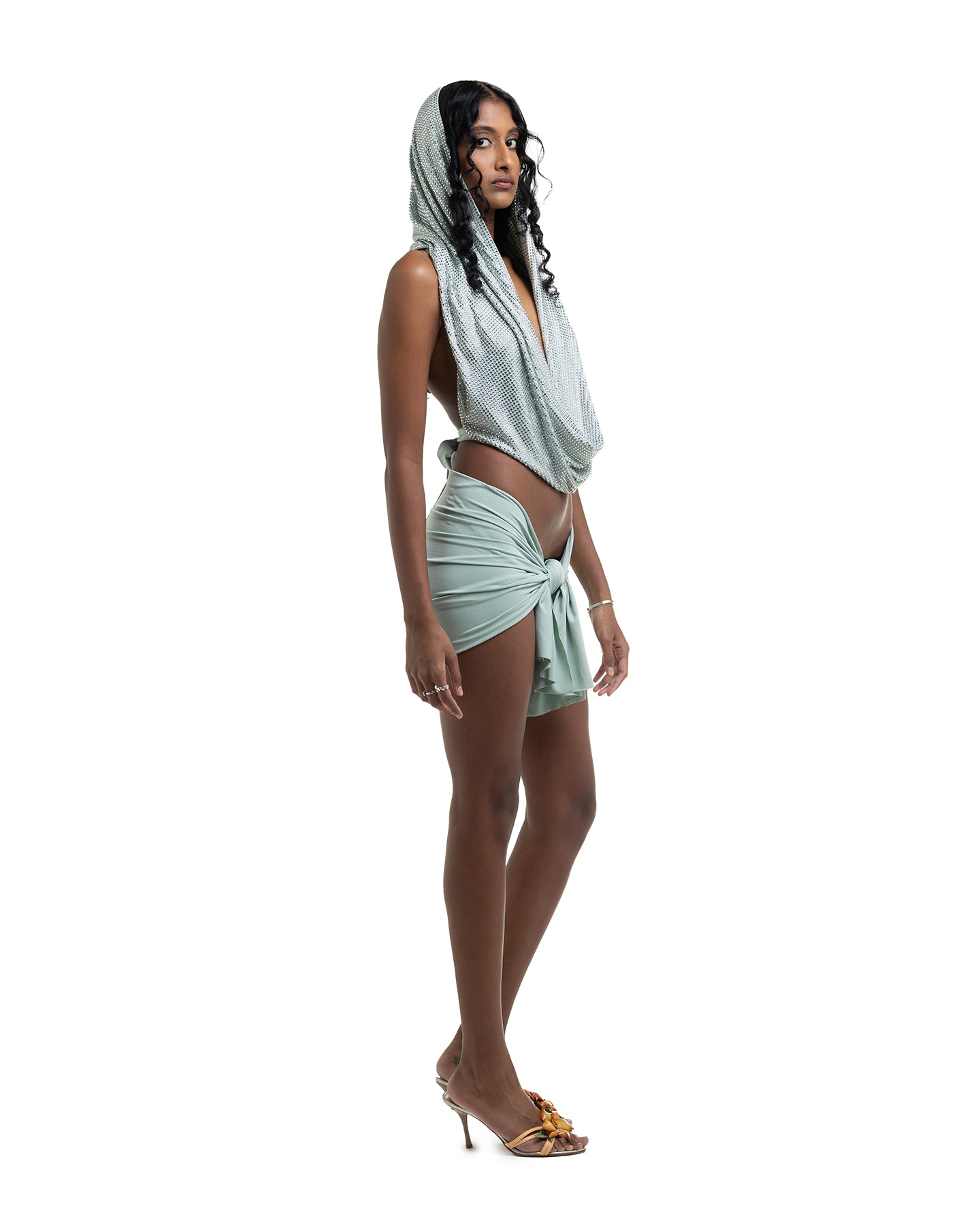 Fully embellished rhinestone crystal halter hood with back tie-up in dusty teal. Beautiful drape, extremely heavy, extremely beautiful.