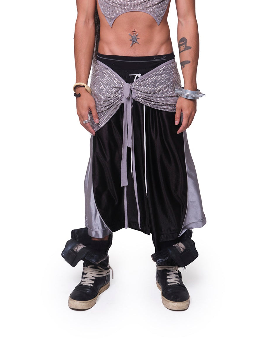Fully embellished rhinestone crystal mesh mini skirt with adjustable side drawstrings in slate-grey. Beautiful drape, extremely beautiful.