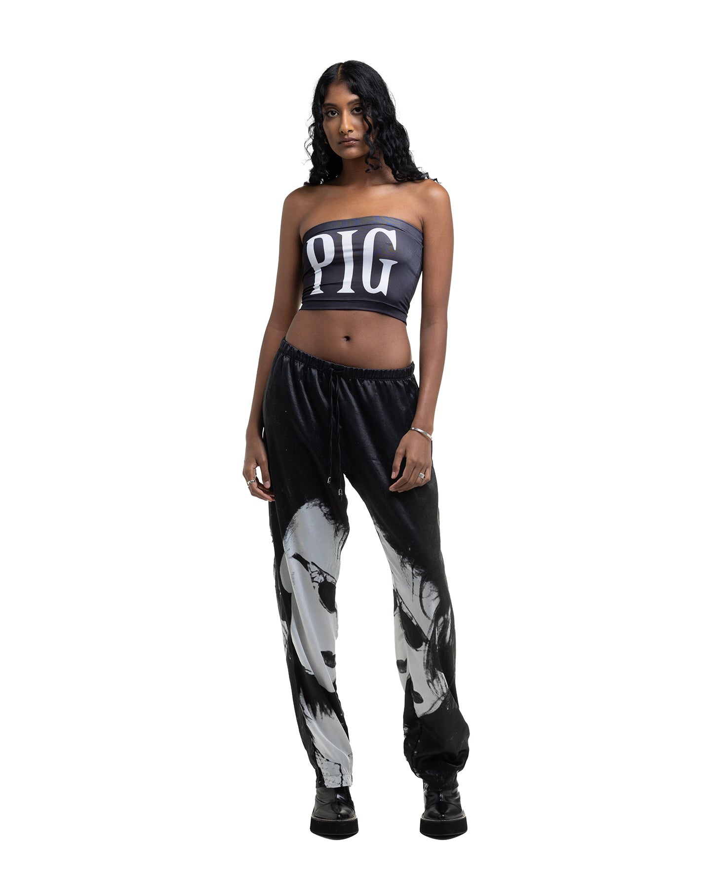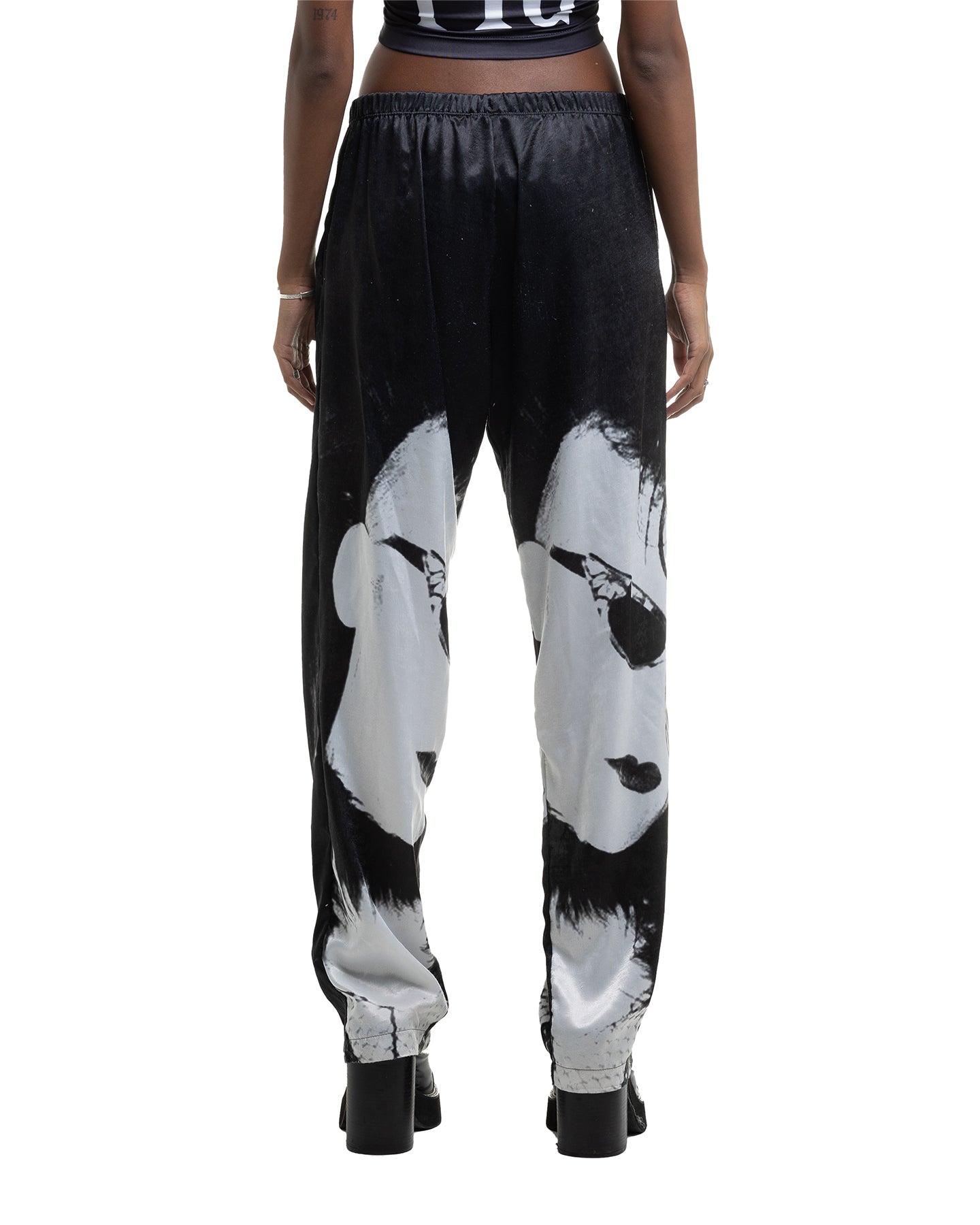 Our elevated wide leg pure silk satin trousers with elastic band and front drawstring. Extreme luxury made from 100% Pure Silk on a sublimated Pigsuit print of our favorite goth bands. Slinky, Silky, Sexy.