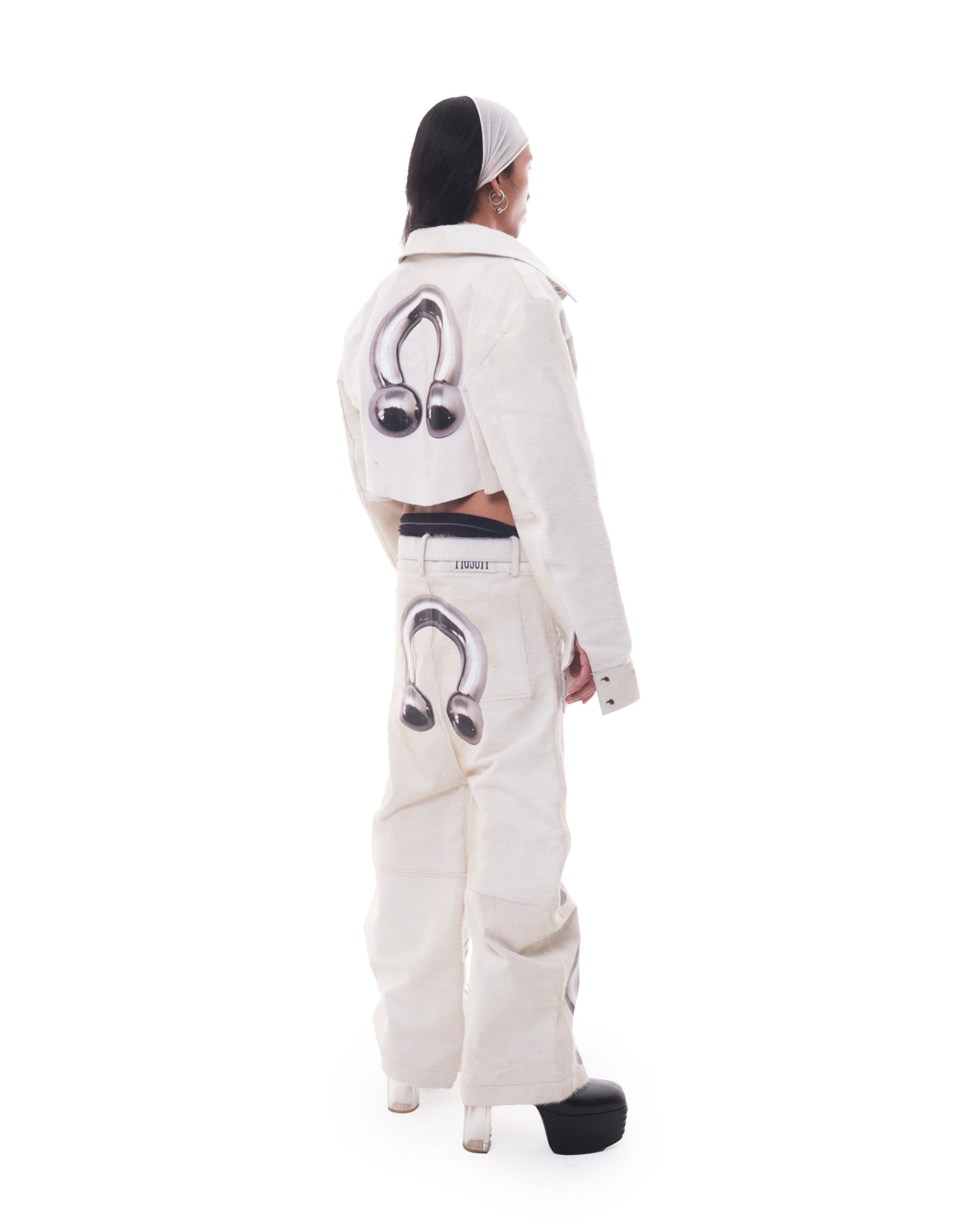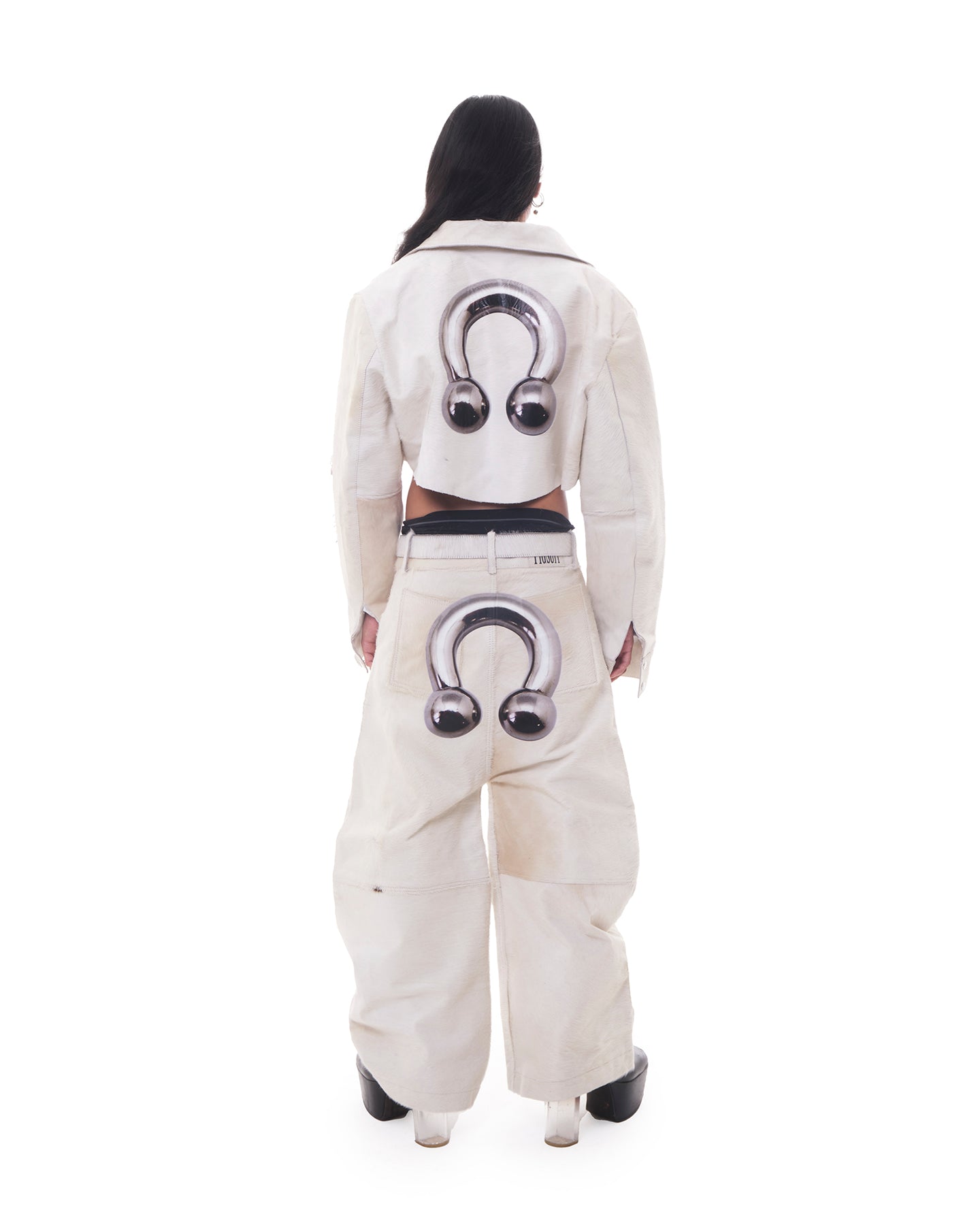 First of its kind, sublimated front and back Prince Albert Piercing Print on Raw Cowhide. This crop jacket features large standing collar, metal snap button fastenings, rounded sleeve with open cuff. Raw stomacher hemline