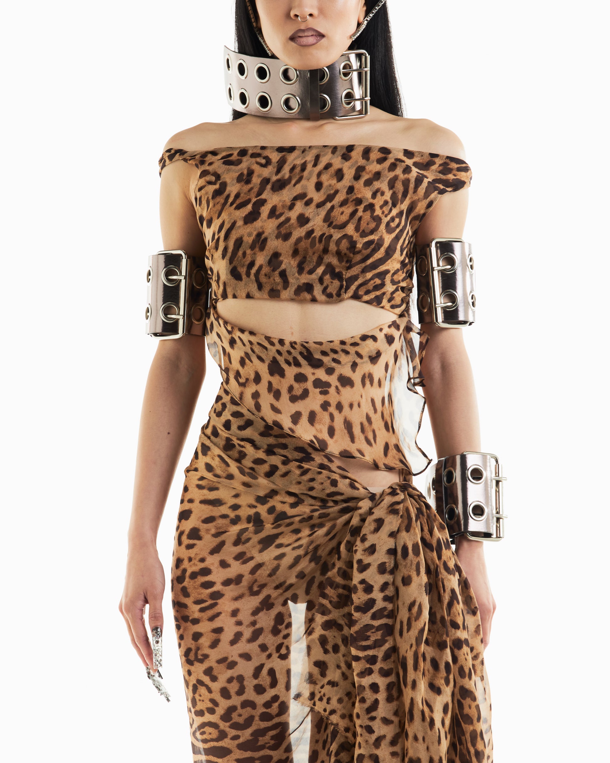 Incredibly chic incredibly luxurious 100% silk georgette off the shoulder tie-up box silhouette crop with cut-away drape handkerchief hem. Comes as a set with sheer tie up maxi wrap sarong. This silhouette was designed during a trip to Berlin drinking into the night making muses and new friends.